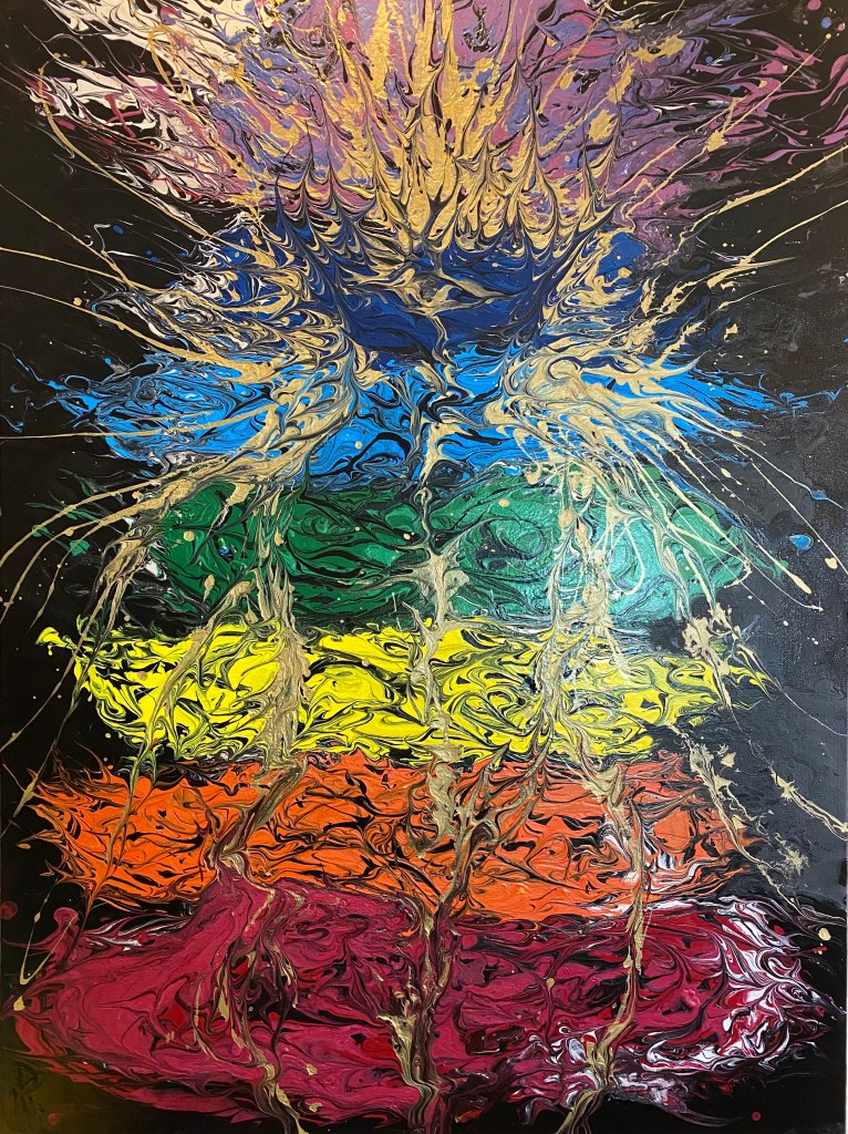 This piece I created while studying Chakras and learning how to rebalance myself. It’s my 7 chakras swirling in a vortex of dark matter, with glimmers of healing light scattered about. Being a mom has broken and healed me repeatedly. It’s a constant dance of learning to do self care to be the best me I can be, and supporting and providing all my family needs of me too. What’s funny is the self care replenishes my energy so I have more to give my family and the world but it so easily can be put on the back burner when the demands and needs of two kiddos under 4 are at their peak.