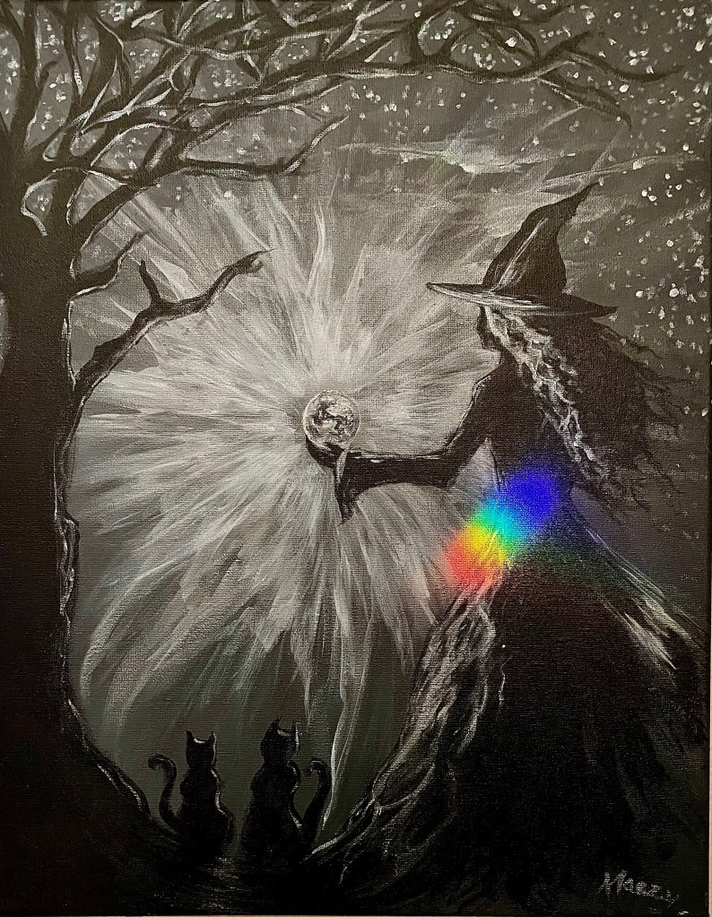 Acrylic painting piece I did for my first painting workshop for a special event in 2018. Painting is in black and white, photographed with a rainbow reflection. This has become one of my favorite unintended self portraits, one my shadow self… the one I’ve hidden from many, pictured with my two familiars who are on the other side, but always with me in spirit and shadow.